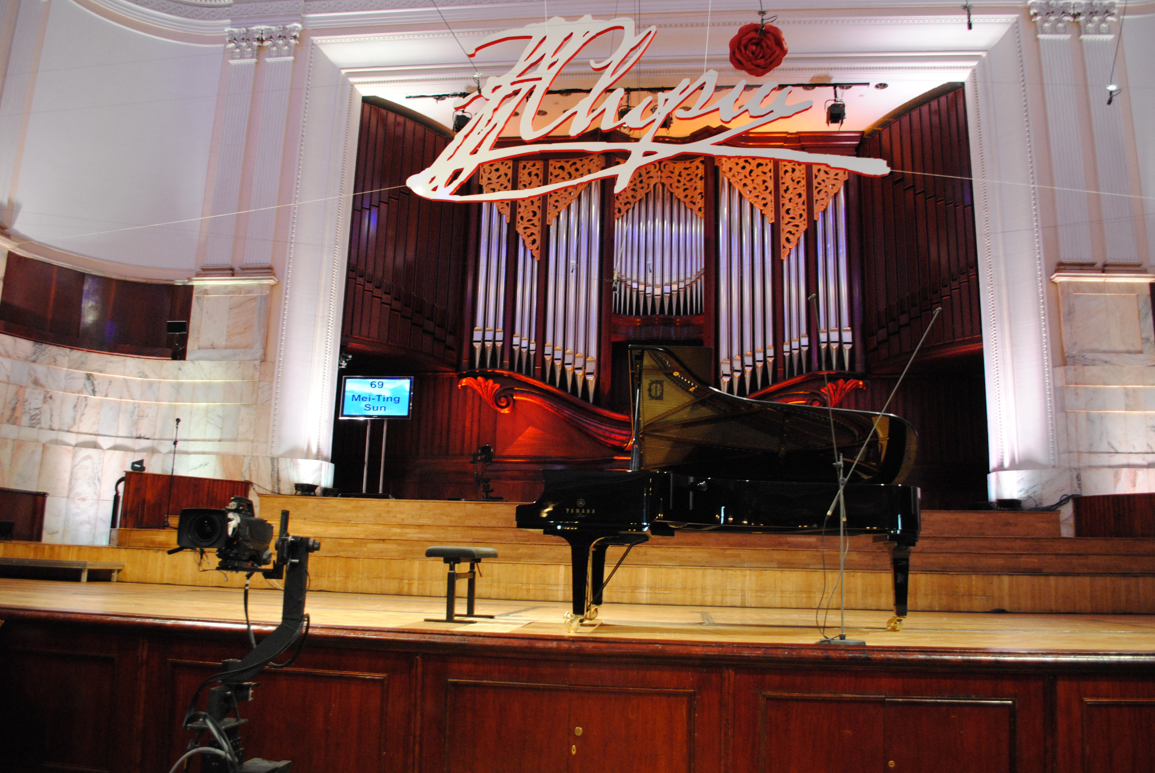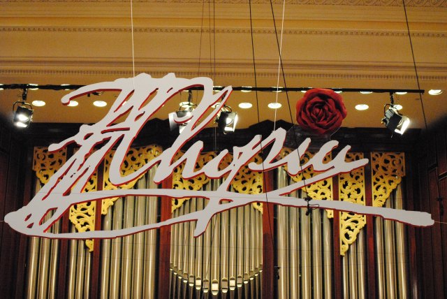 The famous Chopin autograph sign hanging above the stage at the National Philharmonic, home of the Warsaw Philharmonic, and venue for the 16th Annual International Chopin Piano Competition.