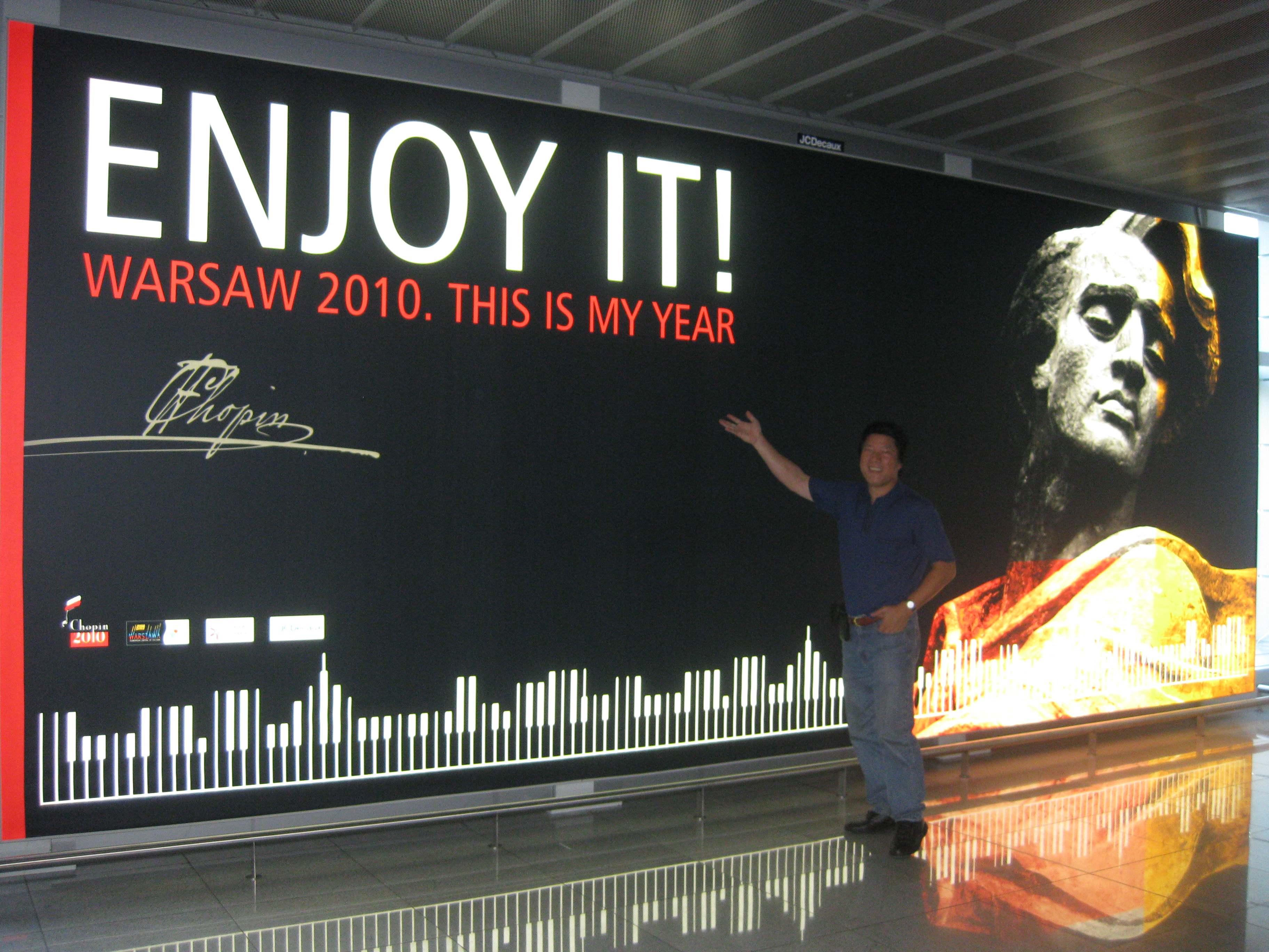 Upon my arrival at the Frederic Chopin International Airport in Warsaw, it became very obvious to me that the International Chopin Piano Competition was probably the most prestigious music competition in the world; certainly for pianists. As soon as I exited customs into the baggage claim area, I was struck with sudden inspiration of emotion, as I found myself gazing at the massive billboard of Chopin in the lobby that took up an entire whole wall of the terminal. This is the birthplace of Chopin.