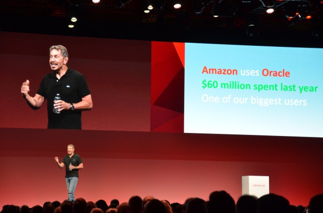 Ellison regarding Amazon: “They are one of the biggest Oracle users on the planet Earth…and every year, that number in green goes up.” Photo by Marcus Siu