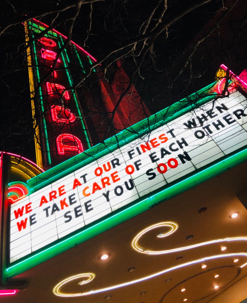 Outside, underneath the retro ceiling before the entrance doors of the theater, newly installed neon lights bounce off eye-popping colors onto the reflective glass cases that display the movie posters of Hollywood’s latest offerings; “Emma” “Onward”, and “Call of the Wild”. Cars full of movie going customers are coming from all different directions from the East Bay while the percolating sounds of the popcorn machine make noise non-stop in the lobby at the concession stand getting ready for the crowds.