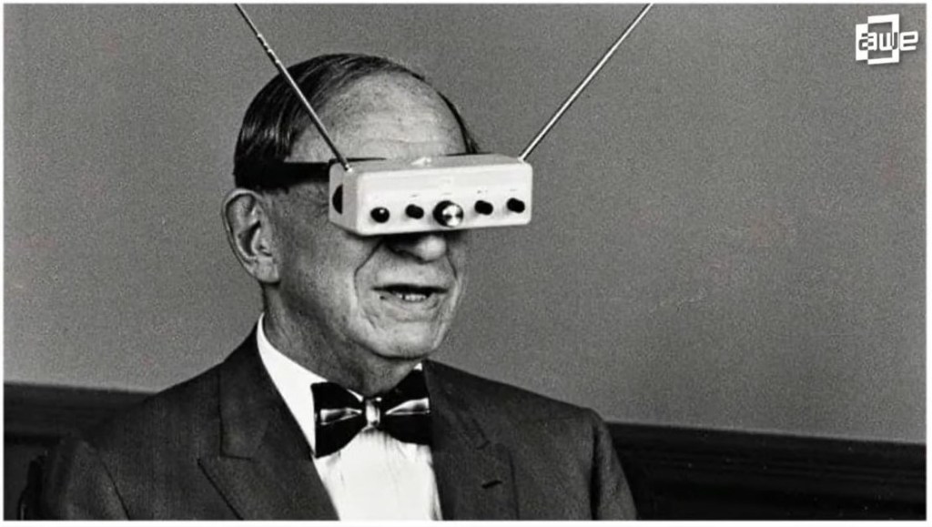 During his keynote, he summarized the state of XR and went through a brief XR history lesson from the beginnings from 1963, with a photo of Hugo Gernsback, the father of science fiction, wearing a type of headworn device that looks like a transister radio with two antennas on it, then five years later, in 1968 with a photo of the first working demo of a head-mounted display created by Ivan Sadland, along with the first keyboard mouse and 2D screen.